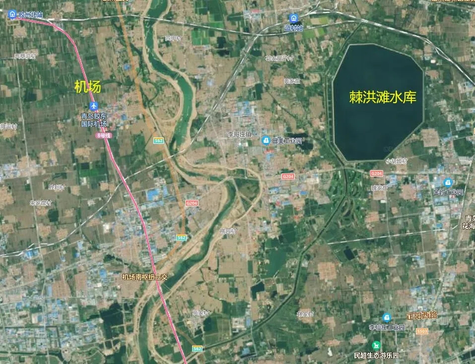 路线起于棘洪滩水库南侧城阳胶州界,跨越大沽河后(大沽河桥先期实施段2.16公里),向西跨越现状G204烟上线,沿规划廊带向西跨越机场高速(北线),终点与新机场高速立交相接。项目全线采用公路主线+辅路型式,预留地面辅路建设条件;主线为高架型式,双向六车道一级公路标准,设计车速100km/h。