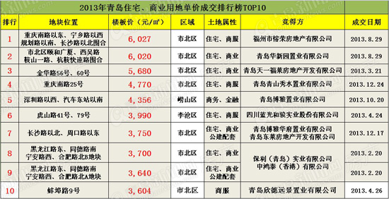 时间继续流淌,转眼进入了8月,29日的一场拍卖会让青岛土地市场彻底沸腾了。位于重庆南路以东、宁乡路以西、规划路以南、长沙路以北围合区域的地块,最后经过120多轮厮杀后,福州市榕荣地产公司以楼面地价6027元/平方米成功击败了其他二家竞买人收获地块,总价884712371元,接近9亿,地块顺理成章地坐上了今年单价、总价“双地王”的头把交椅。同天登上拍卖台的还有市北区颐和广厦、西吴路鞍山一路、杭鞍快速路围合区域地块,叫价之疯狂丝毫不亚于前一宗地块,127轮之后,最终该地块被本地房地产企业——华新园置业有限公司成功揽入怀中,成为单价成交排行榜的“榜眼”。成交价为楼面地价6020元/平方米,成交总价488306280元,超过4.88亿。(查看相关新闻)