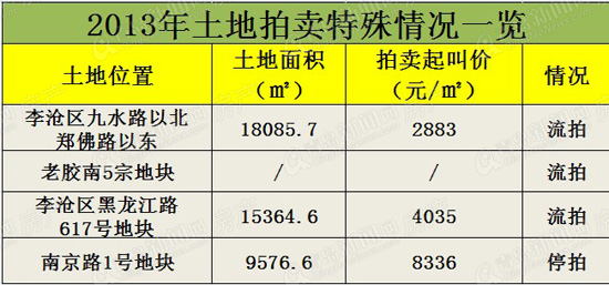 几家欢喜几家愁。有的地块能够让开发商疯狂地大战百余回合,而有的地块就是无人问津、惨遭流拍。回顾2013年,李沧区九水路以北、郑佛路以东地块在今年7月遭遇流拍,这已不是该块第一次“亮相”。据悉,该地块早先规划为住宅用地,在2012年8月青岛市规划局调整为商业服务业设施用地,但因为无人举牌应价,地块的前途未卜(查看相关新闻)。黑龙江路617号地块是一宗商务金融地块,曾在2012年7月、2013年6月先后两次登上拍卖台却均以失败收场,不少业内人士猜测超4000元/㎡的起叫价定价过高是“主因”。而5月的老胶南,土地市场十分火热,虽然很多地块都找到“新东家”,但仍有5宗始终难逃流拍。(查看相关新闻)