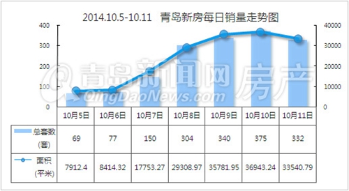 [摘要] 根据青岛新闻网房产频道数据显示,2014年10月5日-10月11日青岛市新房共成交1647套,总成交面积169654.94㎡,环比前一周上涨约13%;其中新建住宅成交1509套,成交