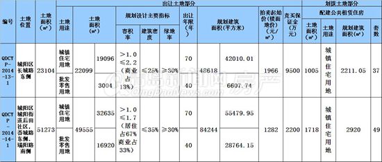 编号QDCYP-2014-14-1号地块位于城阳街道后田社区、荟城路东侧、瑞阳路南侧,土地总面积51273㎡。其中出让部分土地面积49555㎡,包含32635㎡的城镇住宅用地和16920㎡的批发零售用地。城镇住宅用地出让年限70年,规划建筑面积55479.95㎡;批发零售用地出让年限40年,规划建筑面积28764.15㎡。容积率大于1.0,小于等于1.7(居住占67%,商业占33%),建筑密度小于等于35%,绿地率大于等于30%。拍卖起始价(楼面地价)1282元/㎡,竞买保证金2200万元。该地块划拨土地共计1718㎡,规划建筑面积2920㎡,将配建公租房不少于49套。