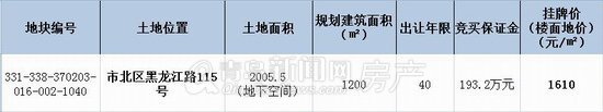 根据拍卖公告显示,331-338-370203-016-002-1040号地块位于市北区黑龙江路115号,紧邻黑龙江南路,项目土地面积为2005.5平方米,全部为地下空间,规划建筑面积1200平方米,土地用途为批发零售用地,使用权出让年限为40年。项目的挂牌起始价为楼面地价1610元/平方米,竞买保证金193.2万元。
