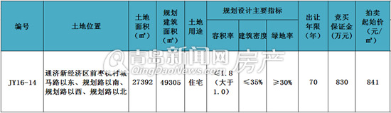 编号JY16-14地块位于即墨通济新经济区前枣杭村城马路以东、规划路以南、规划路以西、规划路以北,占地面积27392㎡,规划建筑面积49035㎡,为纯住宅用地,出让年限70年。规划指标方面:容积率≤1.8(大于1.0),建筑密度≤35%,绿地率≥30%,竞买保证金830万元,拍卖起始价841元/㎡。