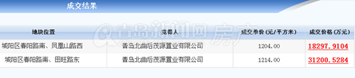 上午9点,地块正式进入网上拍卖系统。首先拍卖的是QDCYP-2016-18-1地块,该地块位于城阳区春阳路南、凤凰山路西,占地面积77122㎡,规划建筑面积151976㎡,土地用途分为住宅、批发零售。住宅用地占地58673.6㎡,规划建筑面积121580.8㎡,出让年限70年;批发零售用地占地14668.4㎡,规划建筑面积30395.2㎡,出让年限40年。地块竞买保证金1亿元,拍卖起始价为1202元/㎡。值得一提的是,该地块将划拨部分科教用地,划拨部分占地面积3780平米,规划建设一处建面2268㎡的幼儿园。拍卖开始后,88号地块率先举牌应价,其他房企并无加价,最终地块顺利被88号竞买人——青岛北曲后茂源置业有限公司(实为青特置业子公司)以楼面地价1204元/㎡将其收入囊中,成交总价为18297.91万元。