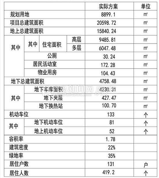 根据最新规划,天泰阳光里项目位于城阳墨水河东、董村居民村西侧、金日紫都小区北侧,小区规划用地8899.1㎡,规划总建筑面积20598.272平方米,其中地上建筑总面积15840.24㎡,地下4758.48㎡。一共四栋楼,有高层也有多层。建筑指标方面,容积率1.78,建筑密度22%,绿地率35%,规划居住户数131户,机动车位133个。