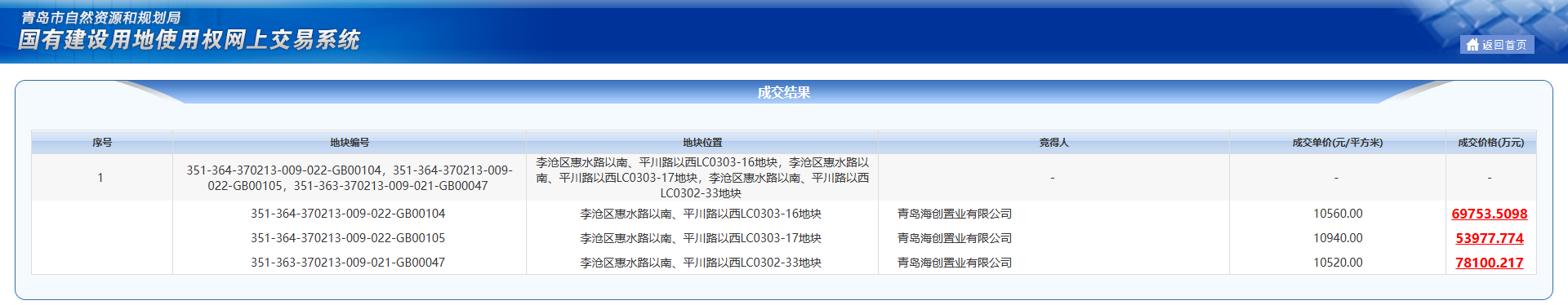 [摘要] 海创集团成功竞得李沧区惠水路以南、平川路以西三宗总建面18.96万㎡优质住宅用地,成交总价20.18亿!