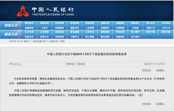 中国人民银行决定于2020年1月6日下调金融机构存款准备金率0.5个百分点(不含财务公司、金融租赁公司和汽车金融公司)。