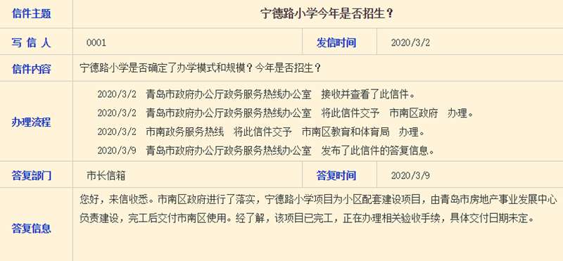 [摘要] 今天,青岛新闻网记者从青岛政务网获悉,针对网友提出的“宁德路小学今年是否招生?”的问题,青岛政务网“市长信箱”答复