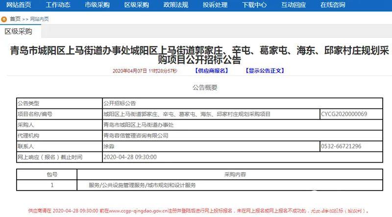 近日,城阳区上马街道王林庄、林家、刘家、侯家、郭家庄社区、辛屯社区、葛家屯社区、海东社区、邱家等九个社区的村庄规划采购项目进行公开招标。招标内容显示,以上九个社区将打造城阳区乡村振兴齐鲁样板。