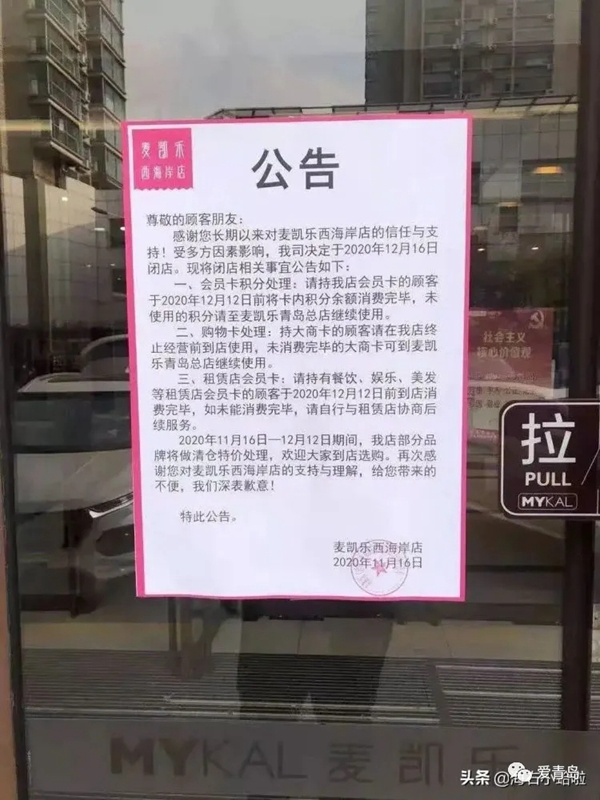 这则公告表明,受多方因素影响,麦凯乐西海岸店决定于2020年12月16日闭店。持有该店会员卡的顾客于2020年12月12日前将卡内积分余额消费完毕,未使用的积分至麦凯乐青岛总店继续使用。
