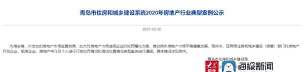 2日,大众网记者从青岛市住房和城乡建设局了解到,为落实省、市出台的房地产市场监管政策,加大对房地产市场违规企业的处罚曝光力度,推动青岛市房地产市场平稳健康发展,现将市、区两级住房和城乡建设(房管)部门对房地产开发企业典型案例进行通报。