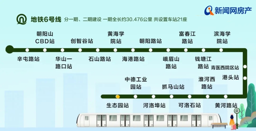 青岛地铁6号线分一期、二期建设,从线路图来看,6号线一期工程起点为辛屯路站,终点为生态园站,串联起了西海岸新区的灵山湾影视文化产业区、经济技术开发区、国际经济合作区等功能区,建成后将成为贯穿西海岸新区中心城区的大运量骨干线。