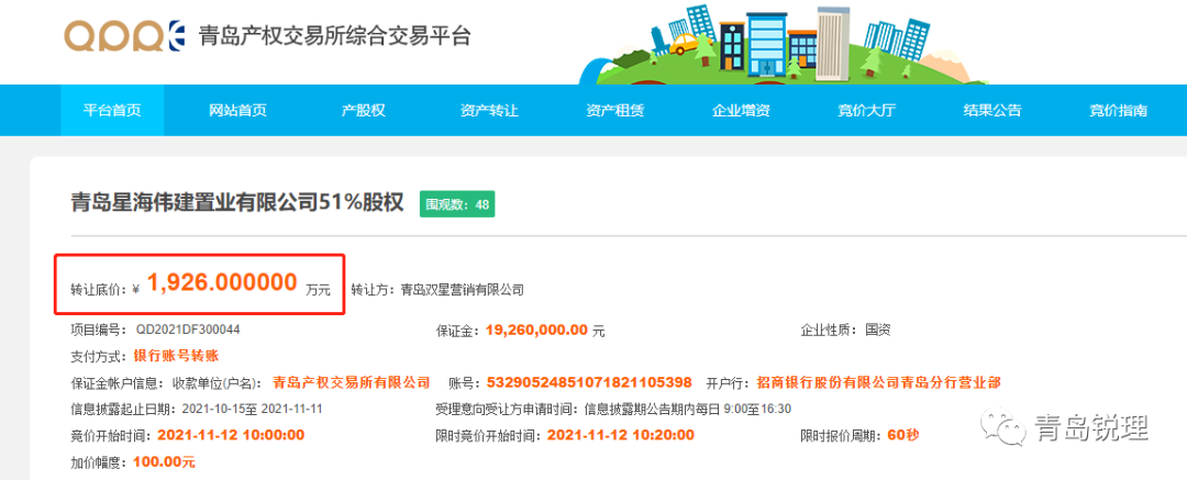 [摘要] 近日,青岛产权交易所发布公告,青岛双星挂牌拟转让青岛星海伟建置业有限公司51%股权,转让底价1926万元,保证金1926万,信息披露起止日期:2021-10-15至 2021-11-11。