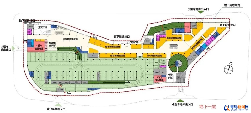 此次规划的地下停车场,以“向地下要空间”的思路破解土地资源约束:地下用地面积超2.2万平方米。三层地下建筑的设计更是实现了“功能分层、人车分流”的科学布局——地下一层聚焦“公共交通枢纽功能”,58个大巴车位兼作公交首末站与长途车发车位,未来市民从青岛站出来,无需横穿马路就能换乘公交,游客乘坐长途车抵达后也能直接在此接驳。
