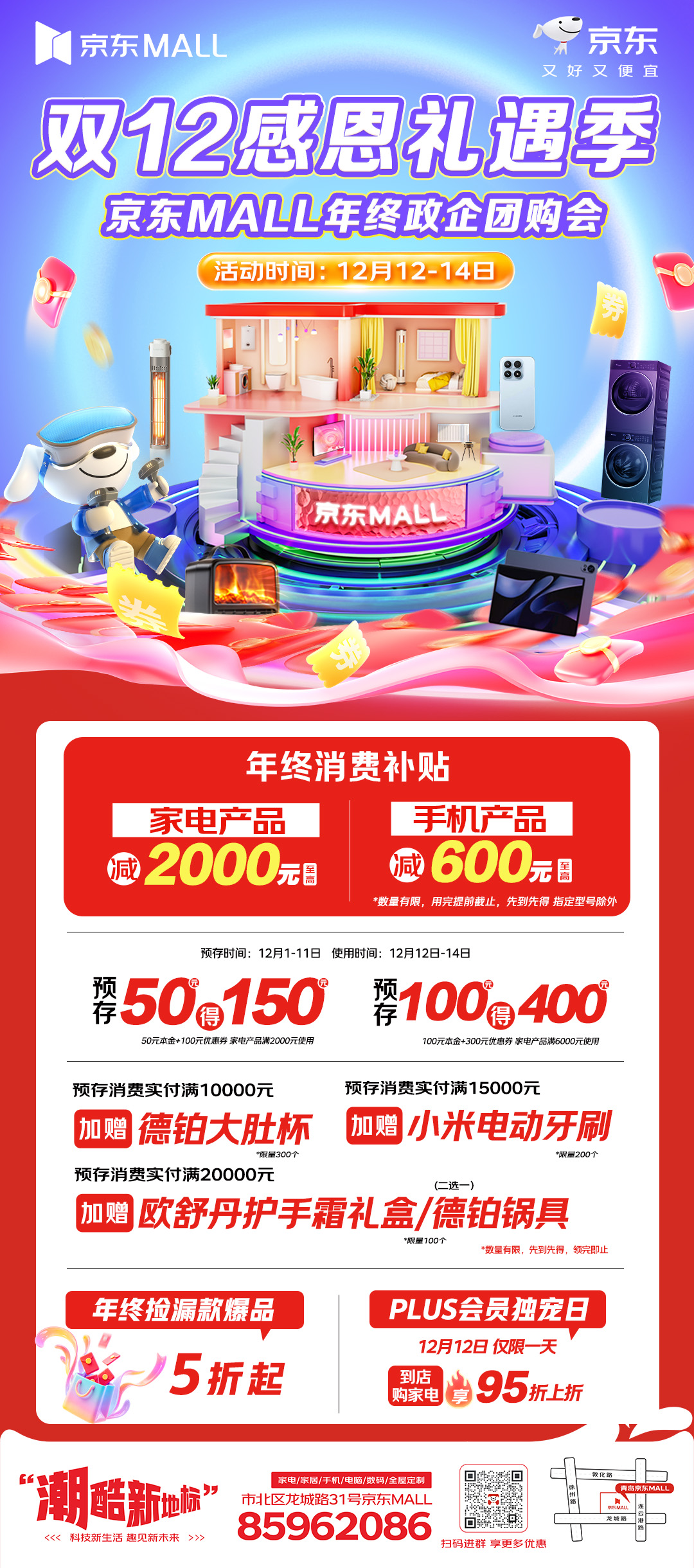 12月12日-14日青岛京东MALL为到店消费的顾客准备了最后一波年终消费补贴:家电单件至高补贴2000元,手机单件至高补贴600元,“真金白银”的补贴将为消费者送上实实在在的优惠!此外,现在还可享预存翻倍的福利,预存50元得150元,预存100元得400元,有需求的顾客可千万别错过预存时间,及时锁定优惠!