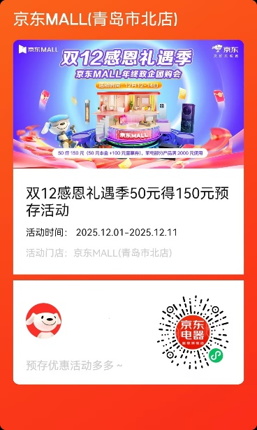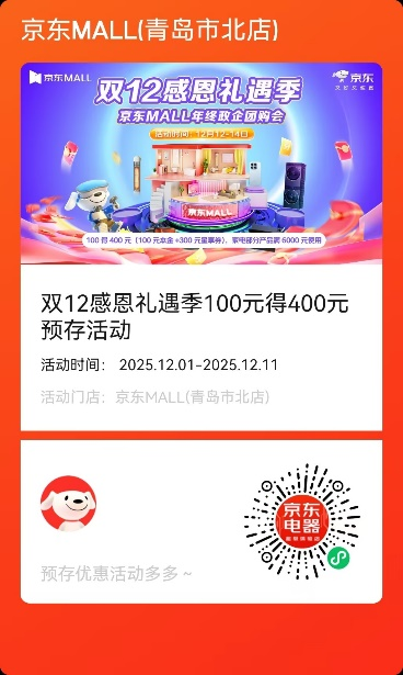 青岛新闻网12月10日讯 随着年末消费热潮的持续升温,为了一如既往的回馈广大消费者,青岛京东MALL将于12月12日-14日开启“双十二感恩礼遇季”活动。据悉,本次活动覆盖手机、家电等品类,通过专属家电、手机消费补贴、预存翻倍、满额加赠等优惠活动,为消费者提供“省心、省钱、省力”的一站式购物体验。