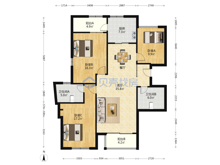 青岛二手房 > 崂山区 > 海尔东城国际北区(辽阳东路海尔路劲松七路劲松八路)151平中楼层385万1南2北南厅套三双厅双卫