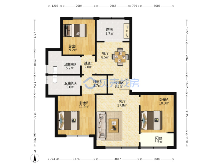青岛二手房 > 李沧区 > 绿城海棠印月南区(广水路铜川路金水路)128.41平中楼层309万双南一北南厅套三双厅双卫