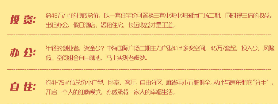 中海国际社区再推出的新品——中海国际广场二期,项目位于李沧区黑龙江路以东,枣山路以南,41-75㎡商住两用小户房源,可办公、投资,即可开启财富之门。