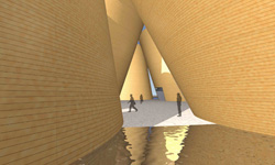 围绕在建筑周边的水池不仅仅是为展馆景观增色不少,同时在室外空气温度超过30度和相对湿度超过70%的时候,水的蒸发可以降低进入室内空气的温度这些水池的水将使用从屋顶收集的雨水。