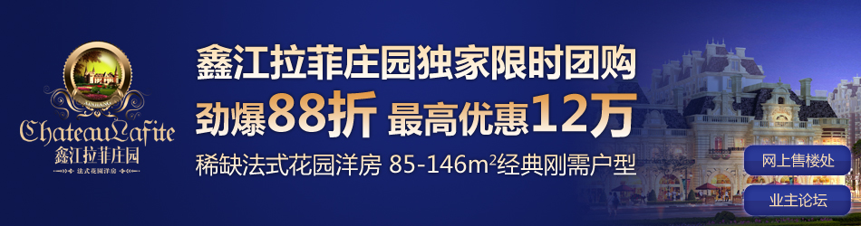 | 【活动说明】 ★鑫江拉菲庄园现在青岛新闻网推出独家团购活动,网友在右侧报名表上填写相应信息即可参加。 ★参与此次团购的网友将独享88折优惠,总房款最高能省12万。 ★本次团购房源为鑫江拉菲庄园在售所有房源,面积在85-146㎡之间,以套二、套三为主。 ★活动时间:2012年6月14日-2012年7月13日。 ★本次购房活动相关事宜的最终解释权归鑫江拉菲庄园所有。 团购咨询电话:4008100532转217 qd拉菲庄园业主群:116578576 【新闻播报】